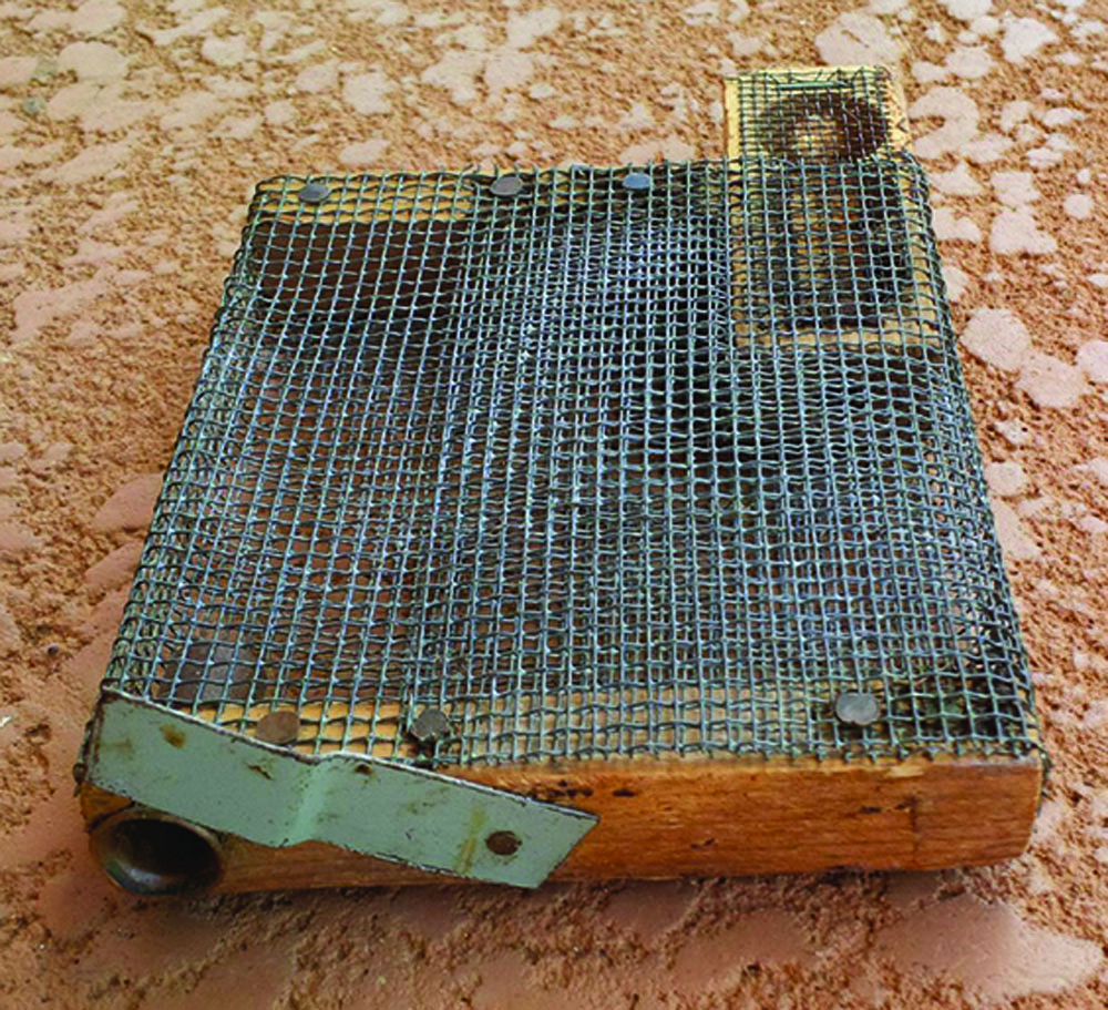 An alternative to the push-in queen cage that does not require the handling of the queen is the Bermuda cage. This cage was designed and built by a very thoughtful and creative beekeeper named Albert Swan, who I met during my recent trip to Bermuda (see Bee Culture June 2015). The Bermuda Cage allows the workers in the hive an extremely large surface area in order to increase exposure to the queen’s scent. The cork is removed from the non-candy end of a wooden commercial queen cage, and the cage is placed into an opening in the Bermuda Cage that holds it snuggly in place. The Bermuda Cage then fits snuggly into a shallow frame, and a deep frame in the brood box is replaced with the shallow frame containing the Bermuda Queen Cage.